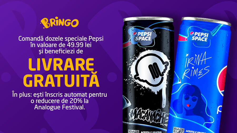 Comandă produse Pepsi participante în campanie în valoare de 49,99 lei, primești livrare gratuită și te înscrii automat în extragerea la sorți pentru cele 500 de coduri cu 20% reducere la festivalul Analoque.